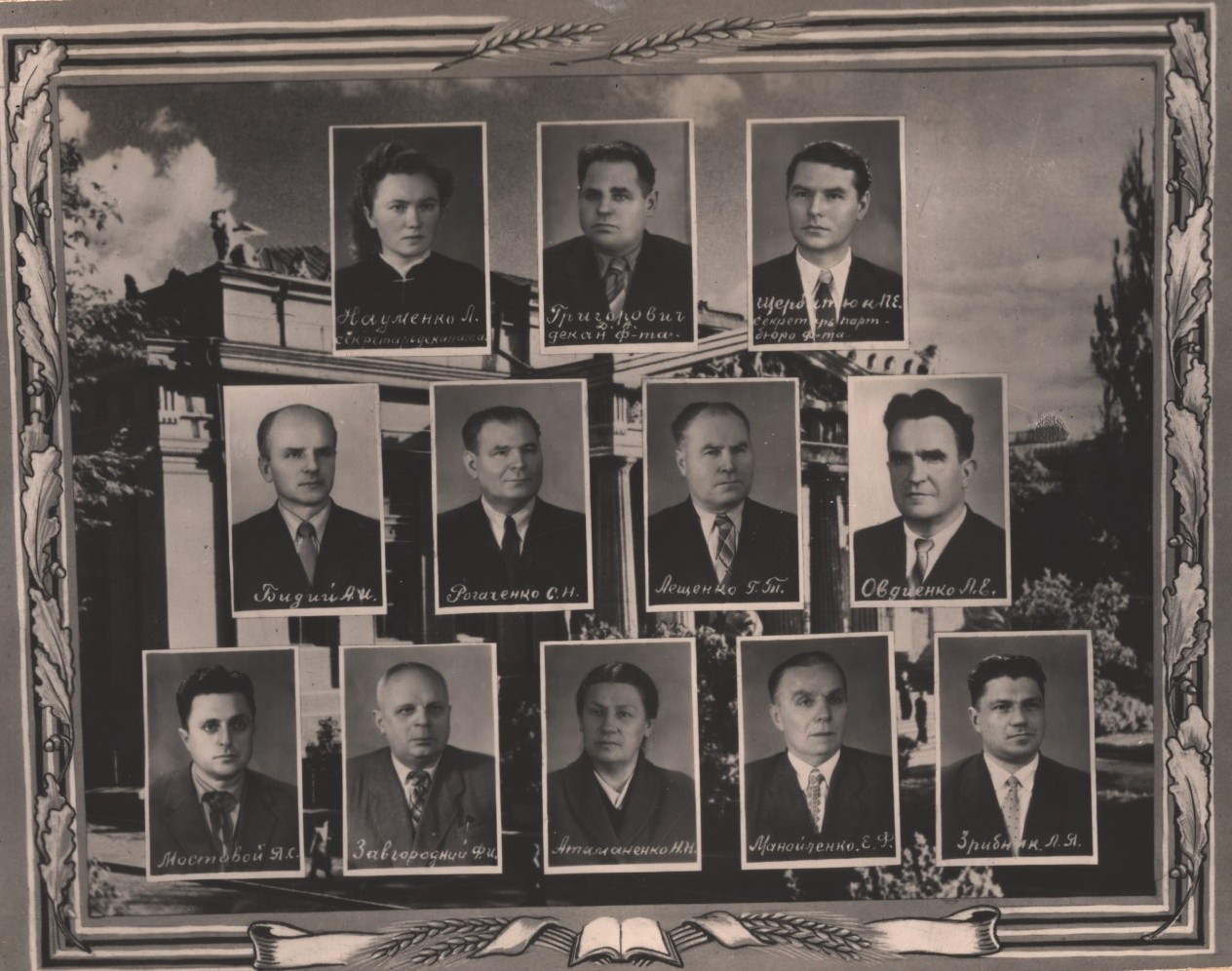 (мова оригіналу: секретарь академии Науменко Л., декан ф-та Григорович Д.Н., секретарь партбюро ф-та Щербатюк П.Е., Бидий А.И., Рогаченко С.Н., Лещенко Г.Т., Овдієнко Л.Е., Мостовой Я.С., Завгородний Ф.И., Атаманенко Н.Н., Манойленко Е.Ф., Зрибник Л.Я.)