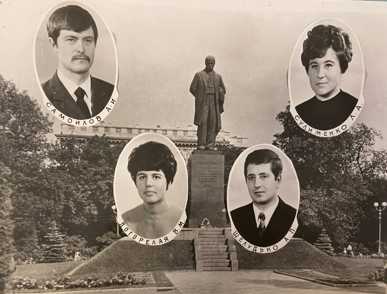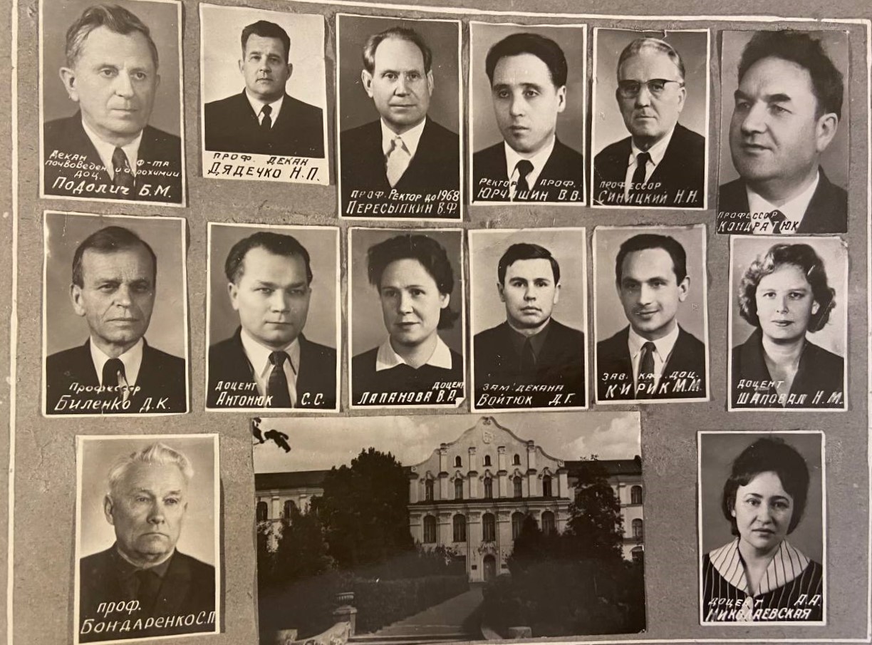 (мова оригіналу: декан ф-та почвоведен. и агрохимии, доц. Подолич Б.М., проф. декан Дядечко Н.П., проф. ректор до 1968 Пересыпкин В.Ф., ректор, проф. Юрчишин В.В., профессор Синицкий Н.Н., профессор Кондратюк, профессор Биленко Д.К., доцент Антонюк С.С., доцент Лапанова В.А., зам. декана Войтюк Д.Г., зав. каф. доц. Кирик М.М., доцент Шаповал Н.М., проф. Бондаренко С.П., доцент Николаевская А.А.)