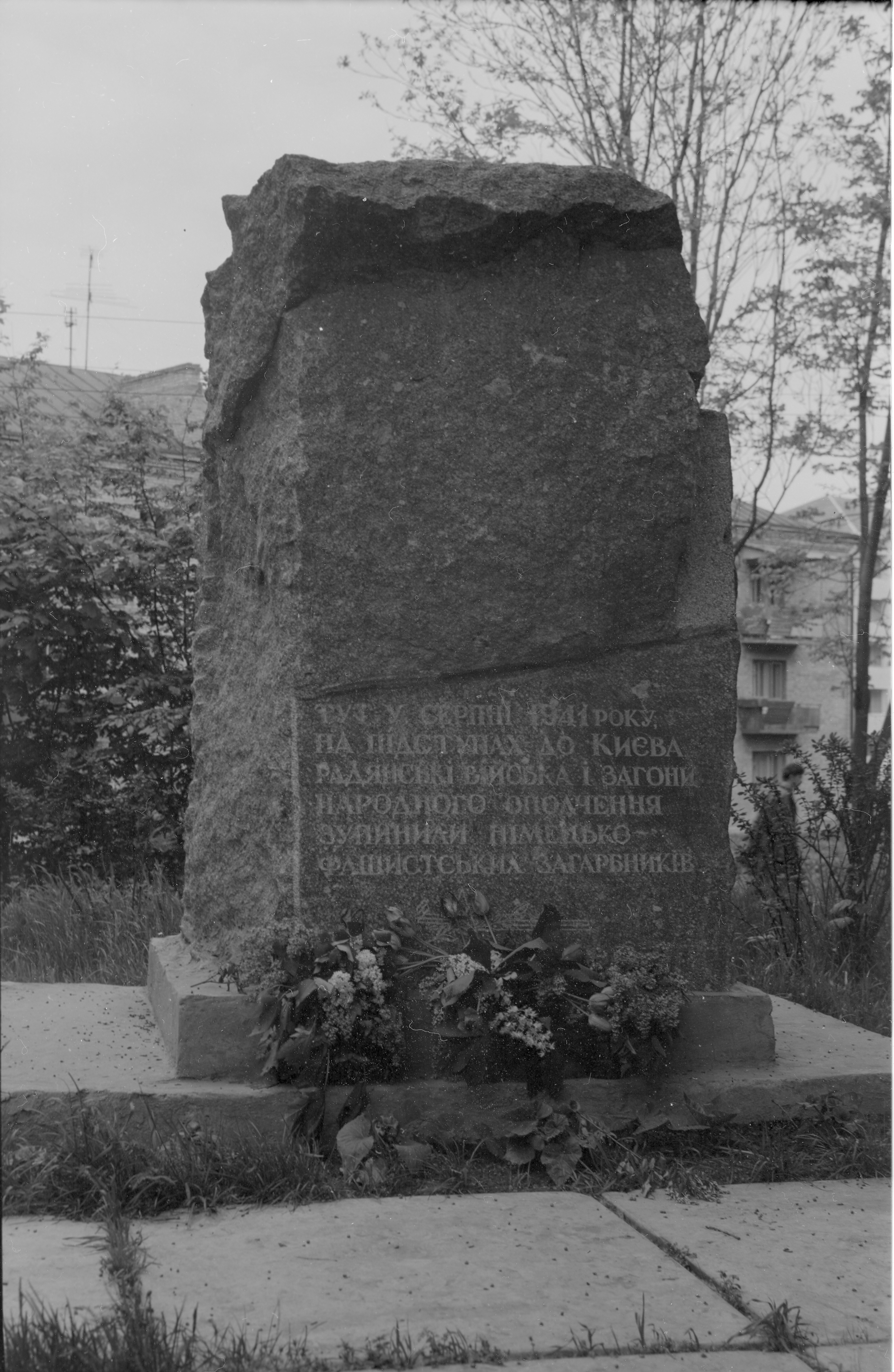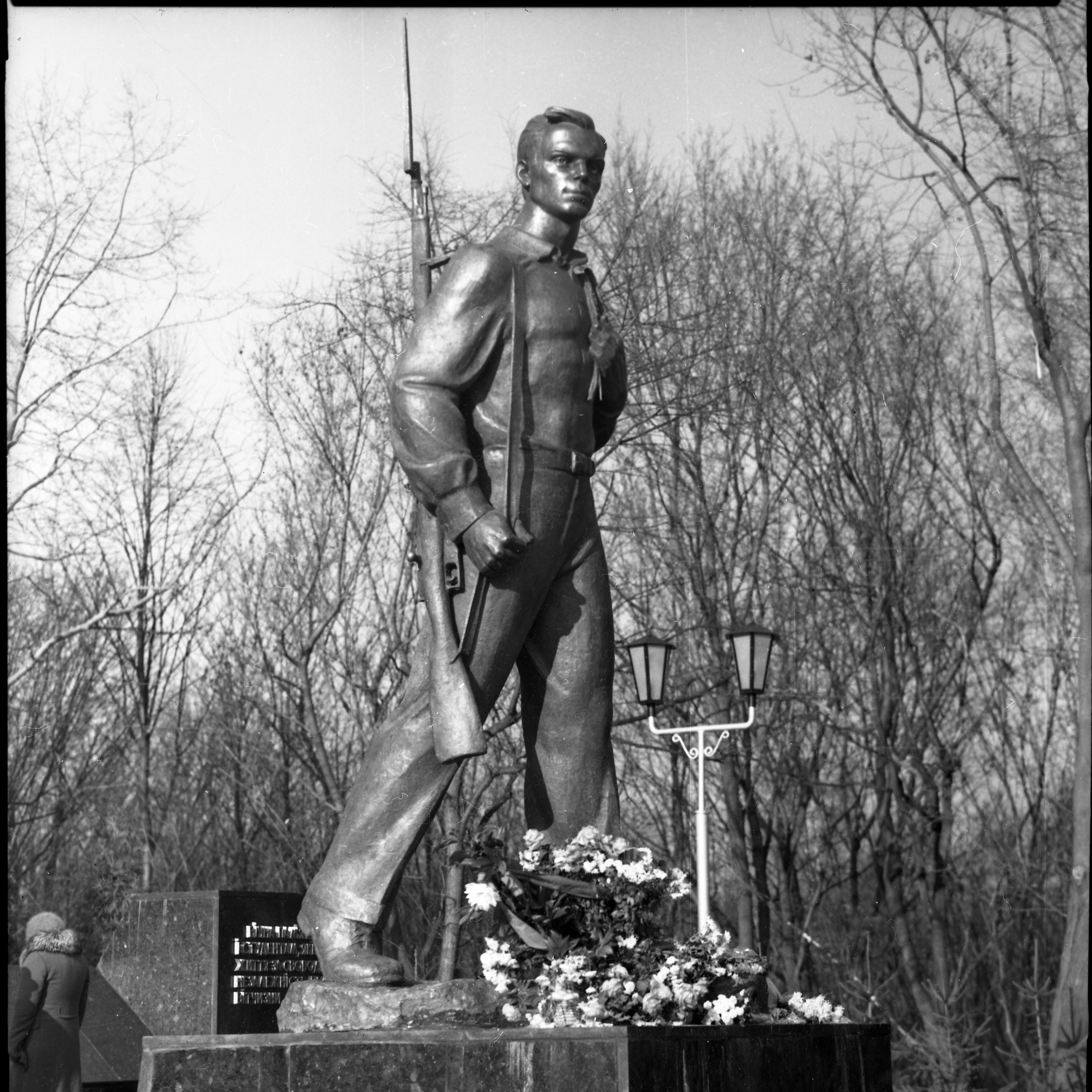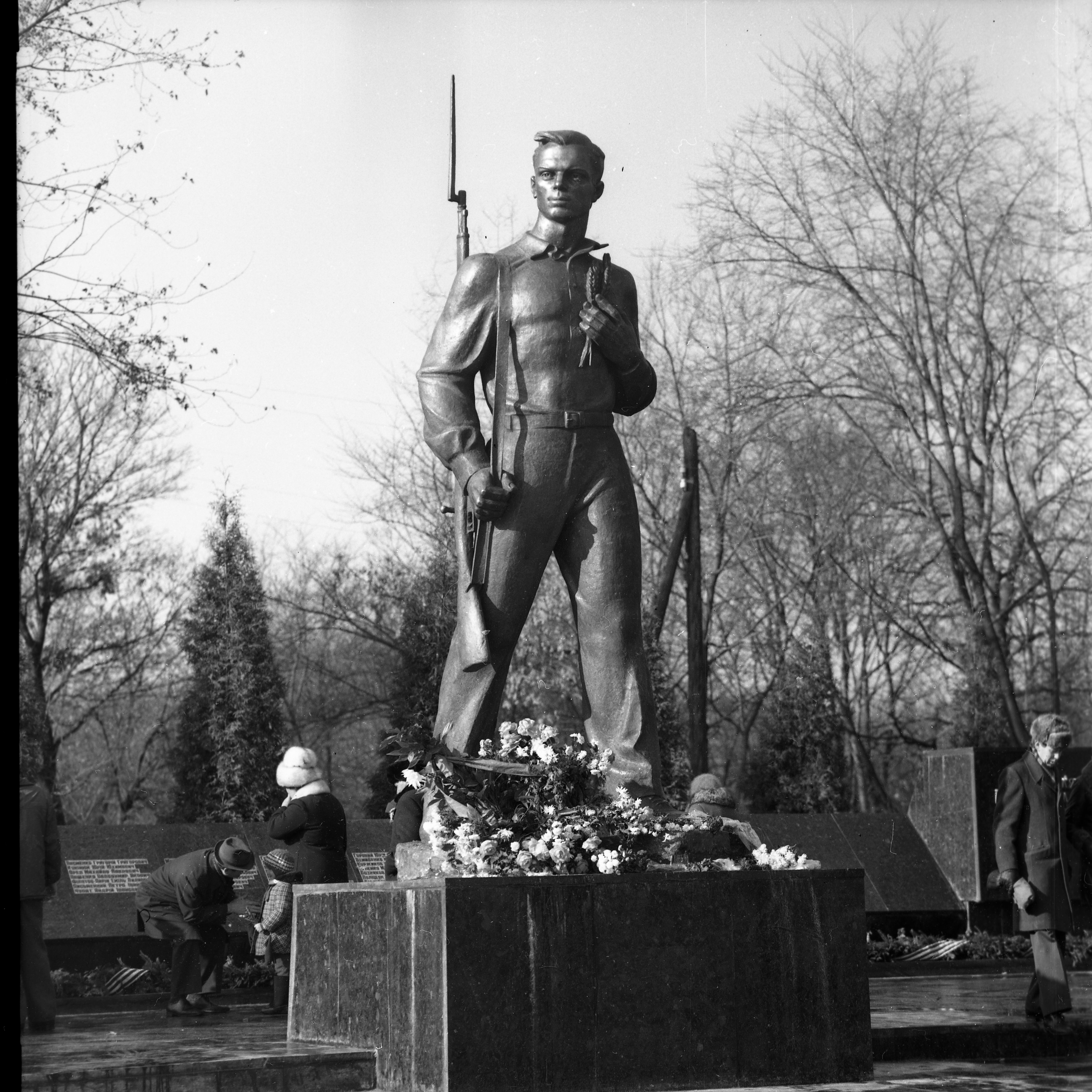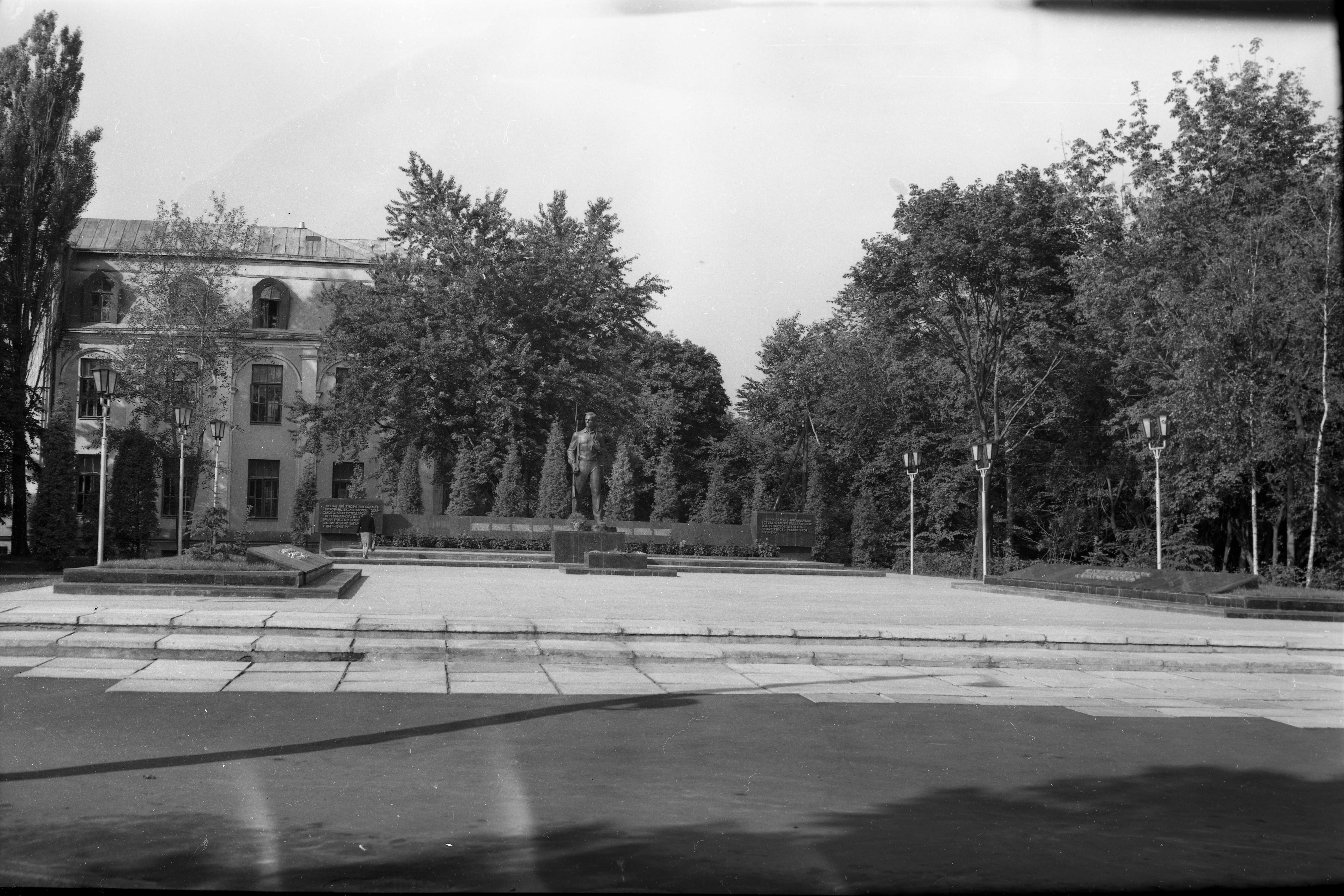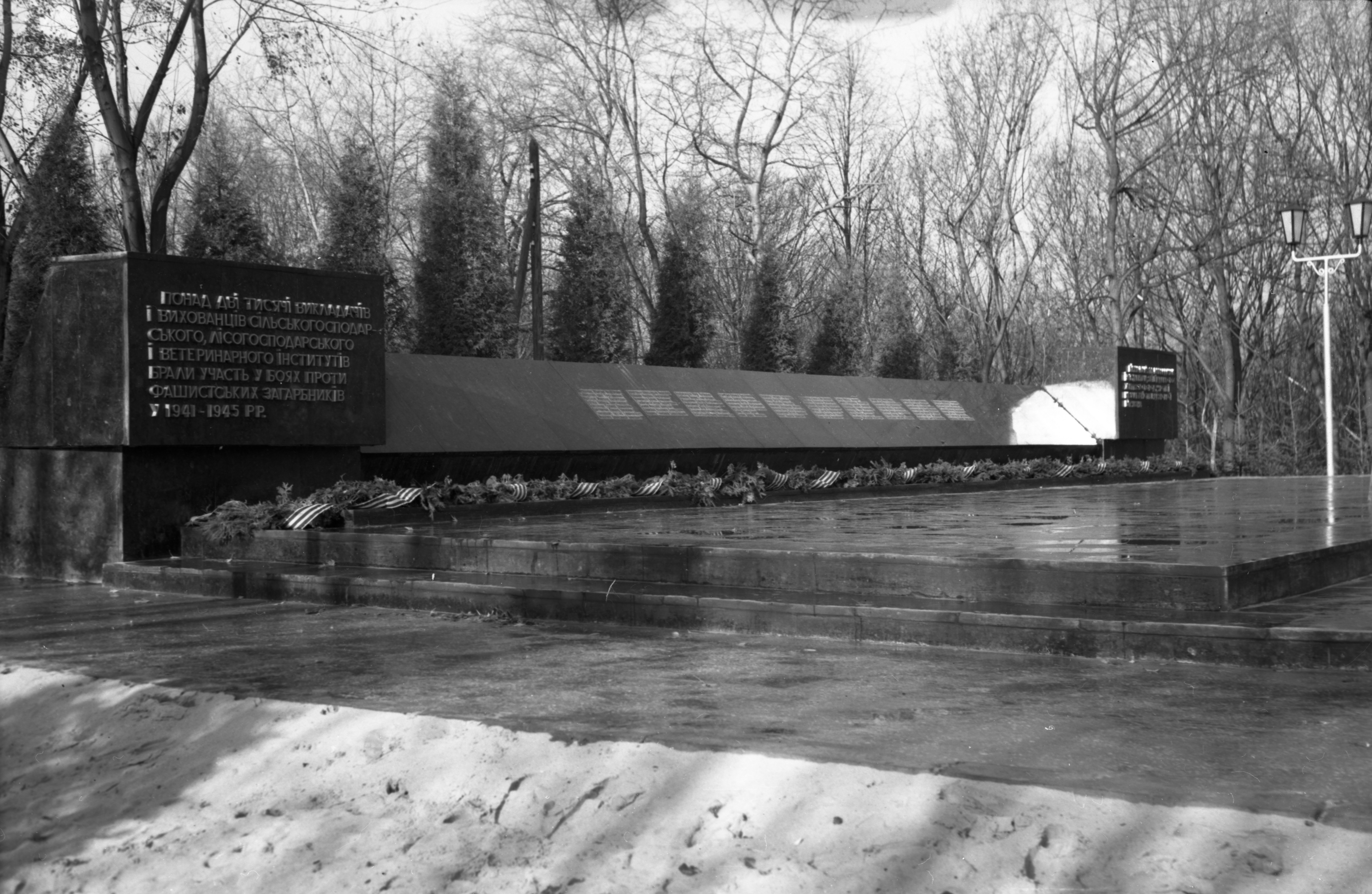 1979 рік, 6 листопада. На місці спільного поховання воїнів-захисників Києва 1941 р. було зведено меморіальний комплекс. Прізвища 79 захисників Голосієво (серед них дві жінки?) занесені на стелу меморіального комплексу. Центральна фігура меморіалу – символічна бронзова скульптура студента голосіївських інститутів, який у червні-серпні 1941 р. вступив до лав захисників. Скульптурна постать меморіалу, обрана скульптором Я. Гончаренком та архітектором В. Гнездиловим, має своїм прообразом студента 3 курсу Київського сільськогосподарського інституту Миколу Скибу.