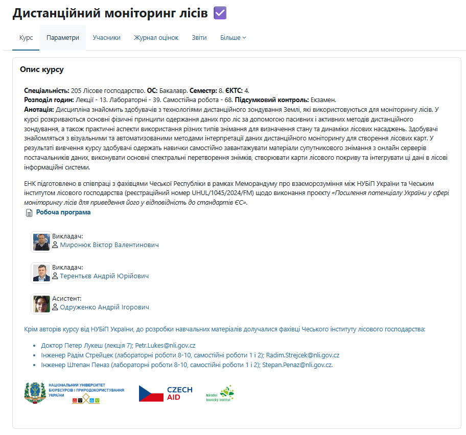 · In cooperation with Czech partners, a new Bachelor-level course titled Remote Sensing Forest Monitoring was developed. During the first year of implementation year, it engaged 70 full-time students, while more than 50 part-time students completed selected practical assignments. An online version of the course is available on the NUBiP E-learning Portal (https://elearn.nubip.edu.ua/enrol/index.php?id=4103).