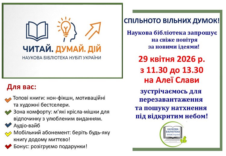 Наукова бібліотека Читати далі Новини всі «ЧИТАЙ. ДУМАЙ. ДІЙ» 29.04.2026 Чому угоди з росією нічого не варті?: наукова бібліотека побувала на презентації книги Євгена Букета 30.03.2026 Від онлайн-сервісів до бібліотечних просторів: наукова бібліотека підбиває підсумки першого тижня очного навчання 24.03.2026 Події всі 29 кві «ЧИТАЙ. ДУМАЙ. ДІЙ» Відео