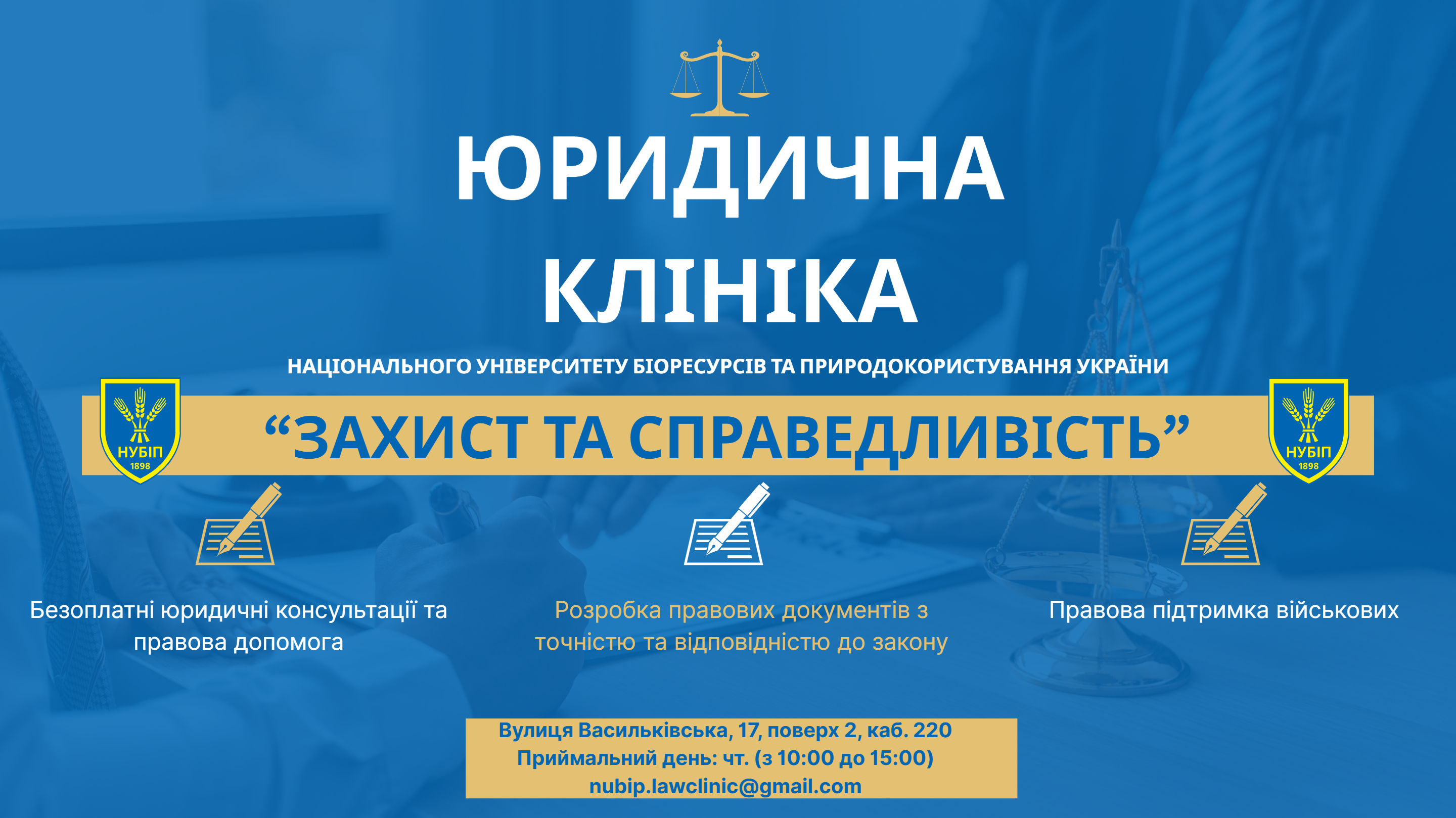Юридична клініка «Захист та справедливість» є структурним підрозділом Національного університету біоресурсів і природокористування України та була створена з метою забезпечення практичної підготовки і проходження навчальної практики студентами старших курсів юридичного факультету. Водночас клініка забезпечує доступ представників соціально вразливих груп суспільства до правової допомоги, сприяє формуванню правової культури громадян, а також здійснює підготовку та навчання студентів у дусі дотримання принципів верховенства права, справедливості і людської гідності.