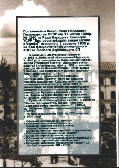 1930 рік - Український лісотехнічний інститут (Постанови Вищої Ради Народного Господарства СРСР від 17 квітня 1930 р. № 1240 та Ради народних комісарів УСРР "Про реорганізацію вищої школи в Україні" створені з 1 вересня 1930 р. на базі факультетів: Лісоінженерного Київського сільськогосподарського інституту та лісового Харківського СП).