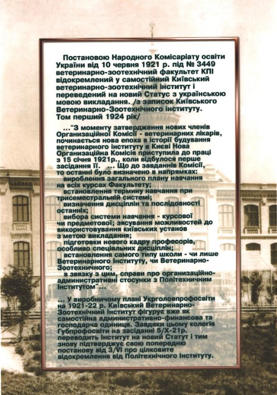 1921 рік - Київський ветеринарно-зоотехнічний інститут (Постанова Народного Комісаріату освіти України від 10 червня 1921 р. під № 3449 ветеринарно-зоотехнічний факультет КПІ відокремлений у самостійний Київський ветеринарно-зоотехнічний інститут).