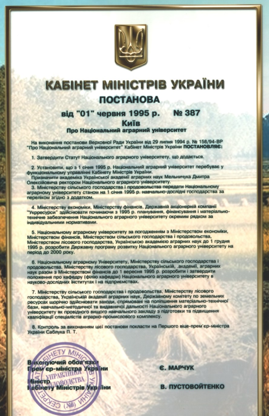 1995 рік - затверджено "Статут" Національного аграрного університету (Постановка Кабінету Міністрів України від 1 червня 1995 р. № 387).