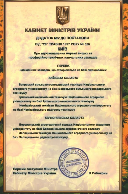 1997 рік - Створення Боярського сільськогосподарського технікуму, Ірпінського економічного технікуму Немішаївського технікуму Національного аграрного університету (Додаток до Постанови Кабінету Міністрів України від 29 травня 1997 р. № 526).