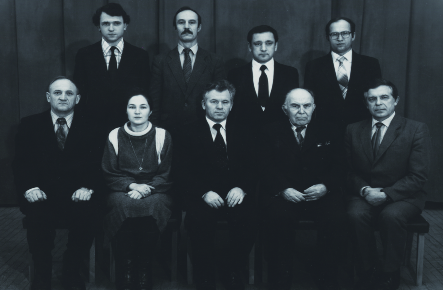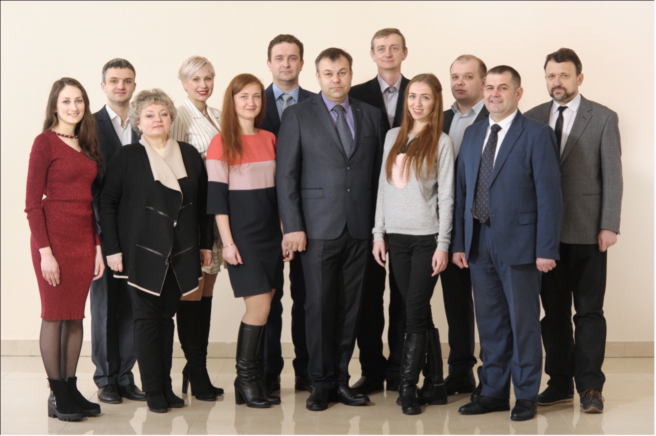 bottom row (from left to right) - Associate Professor V. I. Borodynya, Professor V. A. Yablonsky, Senior Laboratory Assistant N. I. Shevchuk, postgraduate student Y. I. Masalovych; top row (from left to right) - Associate Professors V. M. Lakatosh, O. A. Valchuk, laboratory assistant M. V. Dolenko, senior lecturer V. M. Mazur, Professor V. Y. Lyubetskyi, Associate Professors Y. V. Zhuk, S. S. Derkach