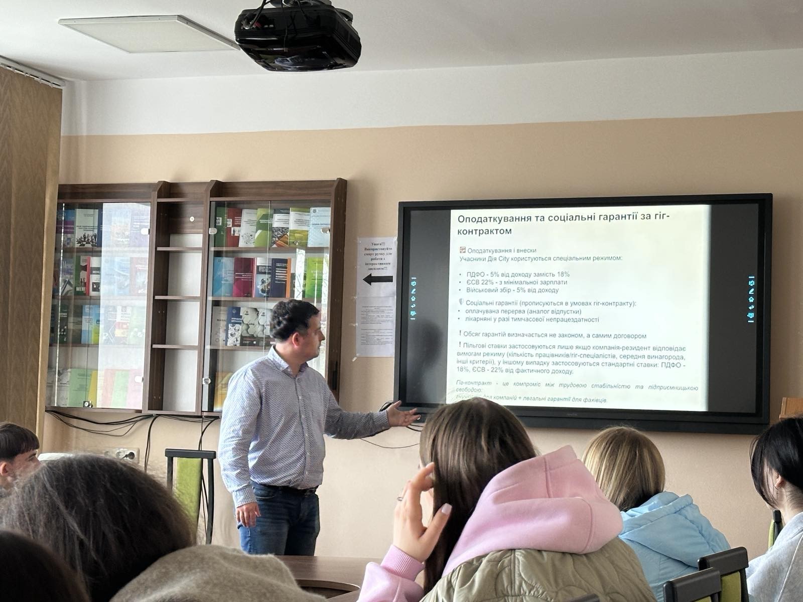 During the lecture, the speaker addressed relevant issues of labor law regulation in Ukraine in the context of labor market transformation and the emergence of new forms of employment. Students received a structured overview of the legal nature and features of employment contracts, gig contracts, collective agreements, and student employment contracts, as modern mechanisms for combining education with professional activity.