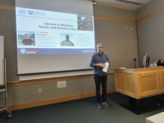 As part of the BridgeUSA Ukrainian Academic Fellows Program, Dr. Oleksandr Soshenskyi, an Associate Professor from the National University of Life and Environmental Sciences of Ukraine (NUBiP), recently visited Oregon State University's College of Forestry. The BridgeUSA program, sponsored by the U.S. Department of State's Bureau of Educational and Cultural Affairs (ECA) and funded by Oregon State University, aims to develop lasting connections between Ukrainian and U.S. academics to strengthen Ukraine's capacity in fields essential for its future rebuilding, including forestry.
