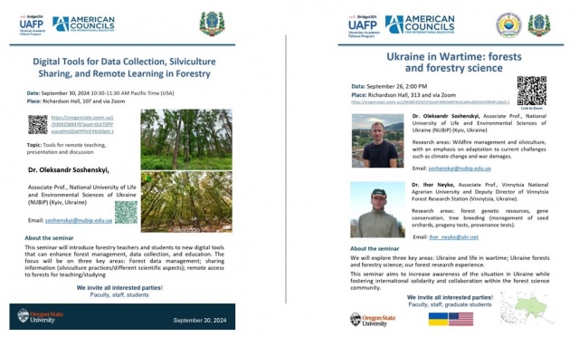 During their visit, the Ukrainian scholars shared their experiences and perspectives on forestry practices in Ukraine, enriching the learning environment for OSU students and faculty. They also presented two seminars: “Ukraine in Wartime: forests and forestry science“ and “Digital Tools for Data Collection, Silviculture Sharing, and Remote Learning in Forestry“.