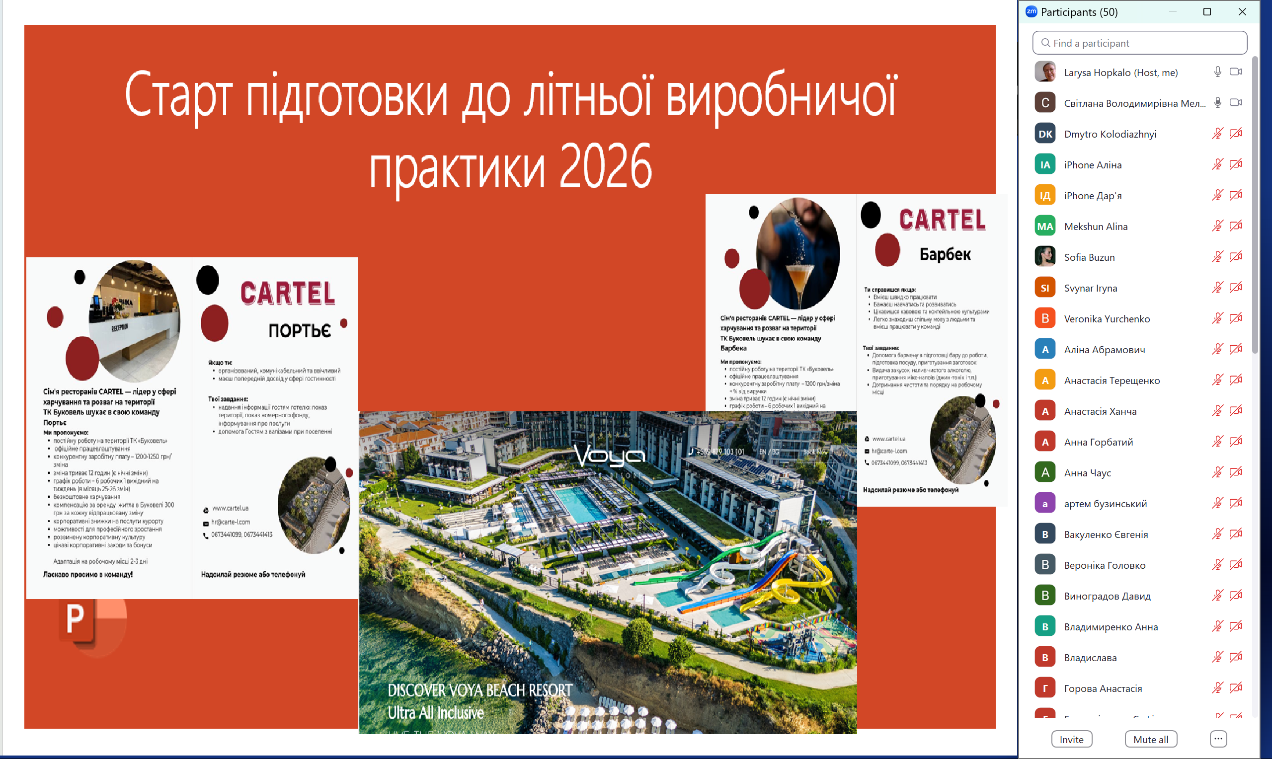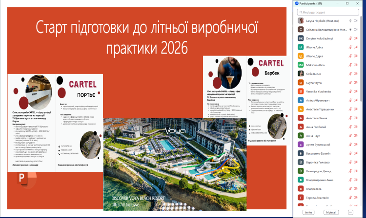 У межах зустрічі здобувачам було презентовано умови проходження виробничої практики у підприємствах різних типів та категорій як за кордоном, так і в Україні. Зокрема, йшлося про можливості стажування у провідних готельних підприємствах Словаччини та Болгарії, де здобувачі матимуть змогу працювати в службах прийому і розміщення, ресторанного сервісу, housekeeping та анімаційних підрозділах. Серед вітчизняних партнерів особливу увагу приділено туристично-рекреаційним закладам курорту Буковель (консорціум «Cartel»), зокрема SPA-готелям високих категорій, а також дитячому закладу оздоровлення та відпочинку Міжнародний дитячий центр «Артек». Крім того, базами практики традиційно виступають міжнародні і вітчизняні готельно-ресторанні комплекси, туристичні підприємства міста Києва, що забезпечують широкий спектр можливостей для формування управлінських і сервісних компетентностей.