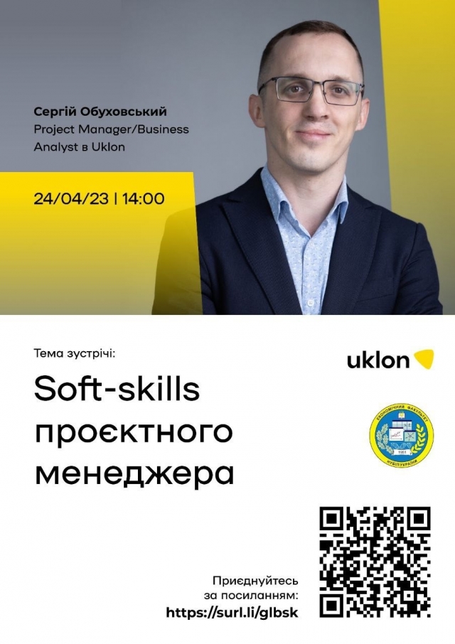 Запрошуємо вас приєднатись до онлайн-зустрічі з випускником економічного факультету, Project Manager/ Business Analist в Uklon Сергієм Обуховським, яка відбудеться 24 квітня 2023 року о 14.00 год.
