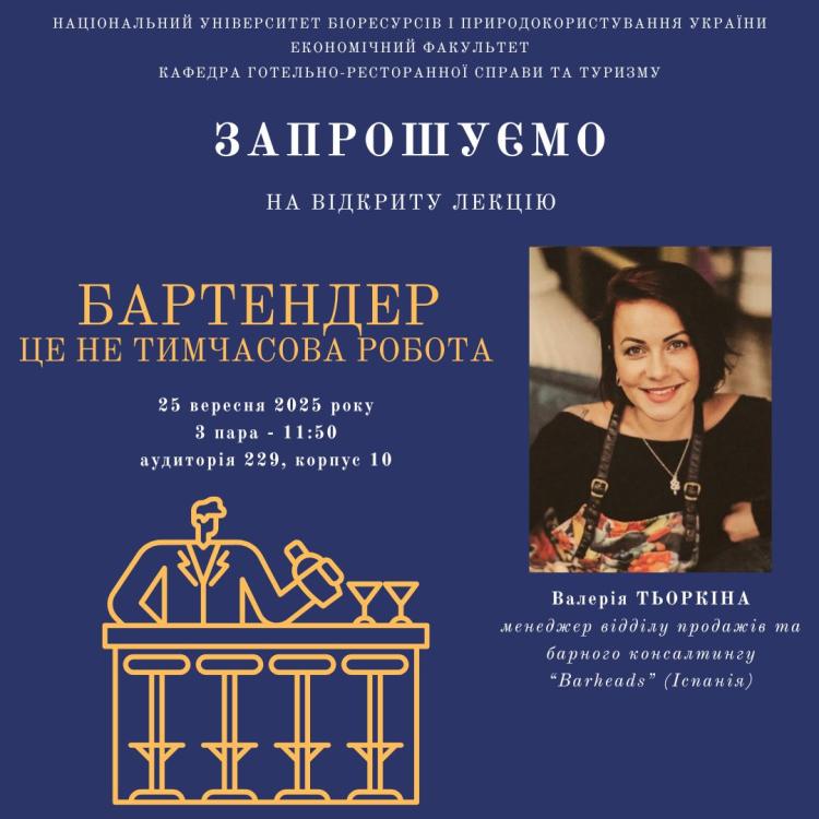 Запрошуємо здобувачів вищої освіти на гостьову лекцію Валерії Теркіної на тему: "«Бартендер це не тимчасова робота»" менеджера відділу продажів та барного консалтингу "Barheads" (Іспанія).