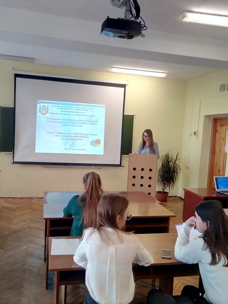 Секційне засідання "Цифрова бізнес-аналітика в активізації соціально-економічного розвитку аграрних формувань" 73-ї НАУКОВО-ПРАКТИЧНОЇ СТУДЕНТСЬКОЇ КОНФЕРЕНЦІЇ "РОЗВИТОК АГРАРНОГО СЕКТОРУ ЕКОНОМІКИ УКРАЇНИ В УМОВАХ ГЛОБАЛІЗАЦІЇ" 27 листопада 2019 р. з привітанням відкрили завідувач кафедри статистики та економічного аналізу Інна Лазаришина і професор кафедри статистики та економічного аналізу Василь Савчук.