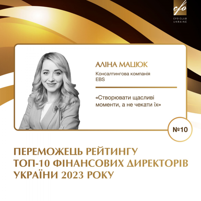 З 2017 року CFO Club Ukraine з метою визначення та визнання найкращих фінансових директорів щорічно організовує Рейтинг «ТОП-10 фінансових директорів України». Аліна Мацюк (Сухоминська) – випускниця економічного факультету 2012 року зі спеціальності «Облік і аудит» увійшла до числа переможців Рейтингу «Топ-10 фінансових директорів України-2023», а також зайняла перше місце в рейтингу «ТОП-3 Найкращих фінансових директорів середнього бізнесу України-2023». Доречно зауважити, що високе професійне визнання Аліна здобула вдруге. У 2020 році наша випускниця вже входила в список переможців рейтингу ТОП-10. Аліна Мацюк з 2012 по 2016 р. пройшла професійний шлях від молодшого до головного бухгалтера консалтингової компанії «EBS» (група компаній), а з 2016 року і по сьогодні – фінансовий директор цієї компанії. Аліна зазначає, що у її підпорядкуванні «… внутрішня юридична служба, адміністративний відділ та фінансовий back office, який надає послуги саме компанії EBS, а не її клієнтам. Це особливість консалтингової компанії, яка має також окремий фінансовий «front office». Доходи компанії EBS у 2023 році зросли більше ніж на 21% в порівнянні з 2022 роком, а чистий прибуток в 2023 році в абсолютних значеннях до 2022-го року склав 67%». Серед багатьох стратегічних задач Аліни та участі в процесах поглинання компаній, ефективної реструктуризації відділів і налагодження процесів та консолідації обліку після поглинання компанії, можна виділити також ініціативи з роботизації процесу проведення банківських виписок з метою підвищення ефективності процесів та економії трудових ресурсів процесу, переведення ділянок обліку на ЕДО та багато інших результатів.