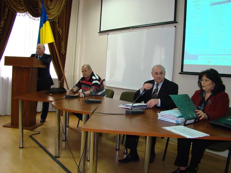 За трибуною - ректор УМО НАПН України, академік Олійник В.В. Далі по черзі: голова профкому Жебровський О.М, перший проректор Кириченко М.О. (вів семінари) і проректор з науково-методичної роботи та міжнародних зв’язків Отич О.М.