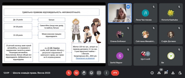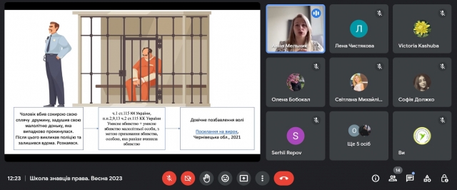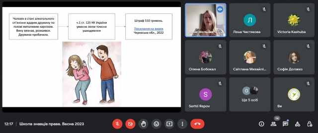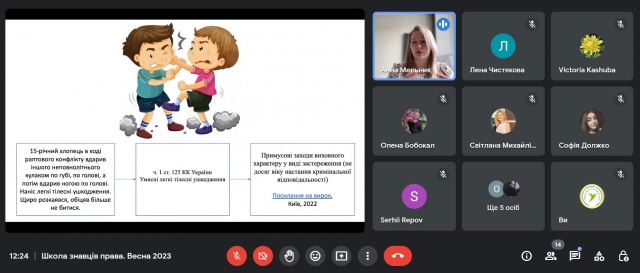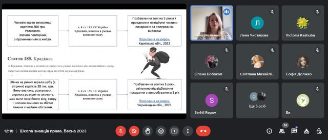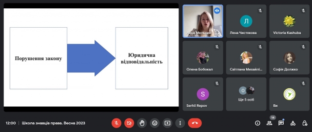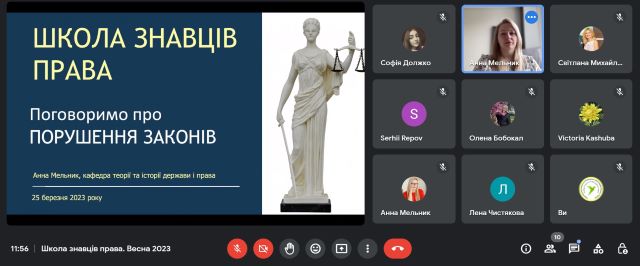 25 березня 2023 року відбулася заключна зустріч в рамках весняної сесії онлайн-вебінарів просвітницького проєкту кафедри теорії та історії держави і права «Школа знавців права». Спікерка заходу асистентка кафедри, докторка філософії з права, практикуюча адвокатеса Анна Мельник розповіла присутнім про порушення законів.