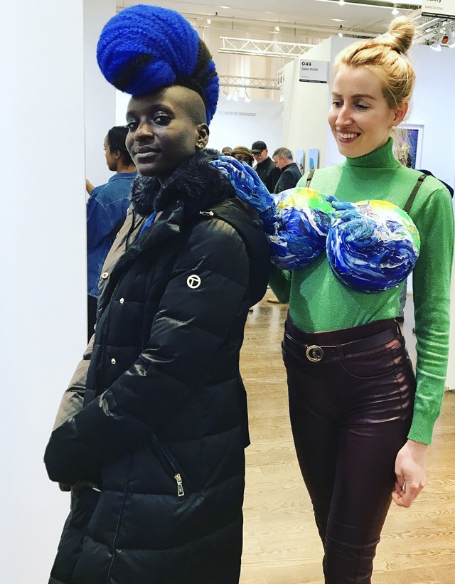 (Ольга сміється) Один колекціонер сказав, що, мабуть, це примара, що цього просто не може бути наяву. Одна жінка зазначила, що її чоловік дуже б хотів, щоб вона також мала груди-Всесвіт. Сек’юріті, які працювали на «Арморі шоу», були вражені, коли побачили мене наступного дня з новим арт перформансом «Матінка – Земля», з якої стирчали вудочки, сказали , що рибачити на цьому арт-ярмарку не дозволяється. (Правила безпеки) Це було дивно, бо з несправжніми вудочками мені б цього і не вдалось. Я прагнула своїм виглядом привернути увагу до проблеми Світового океану та його забрудненості. Наголосити на проблемі екології водних ресурсів.