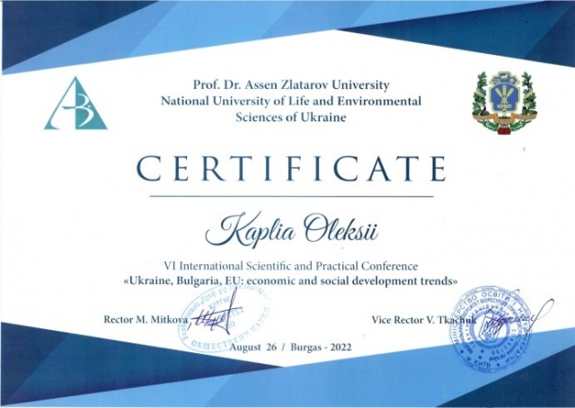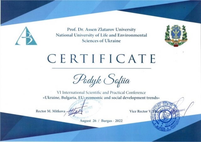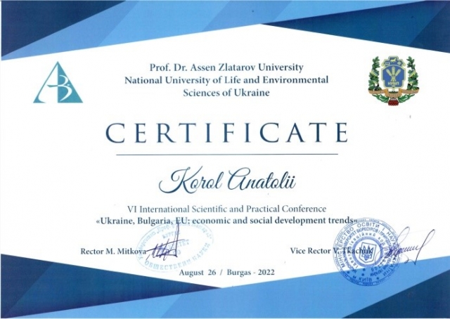 Вже вшосте відбулася Міжнародна науково-практична конференція «Україна, Болгарія, ЄС: економічні та соціальні тенденції розвитку» започаткована кафедрою фінансів. Цьогоріч у зв'язку із воєнним станом в Україні, конференція проходила в он-лайн режимі, що дало змогу під'єднатися понад 90 учасникам із 19 навчальних закладів України, Болгарії, Польської Республіки, Айзербажану, Грузії. Відкрив конференцію співголова організаційного комітету проректор НУБіП України Вадим Ткачук, який наголосив на важливості подібних академічних ініціатив для практичної реалізації стратегічного курсу України на набуття повноправного членства в ЄС у такий складний для країни час та побажав учасникам конференції плідної роботи.