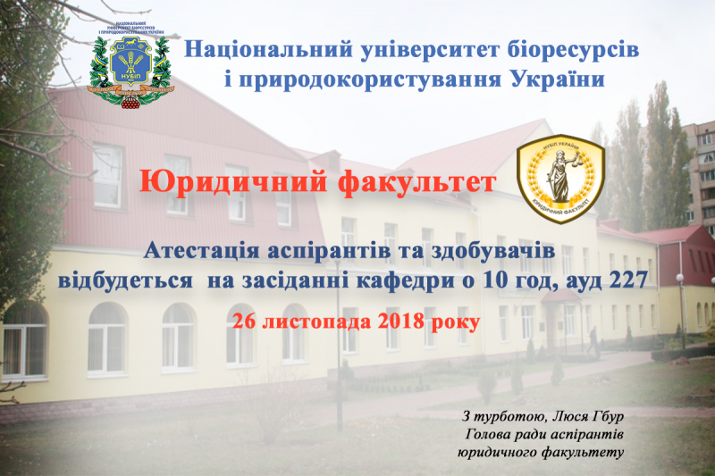 Атестація аспірантів та здобувачів на кафедрі адміністративного та фінансового права 26.11.2018 р. 23 листопада 2018 року 02:00 - 02:00