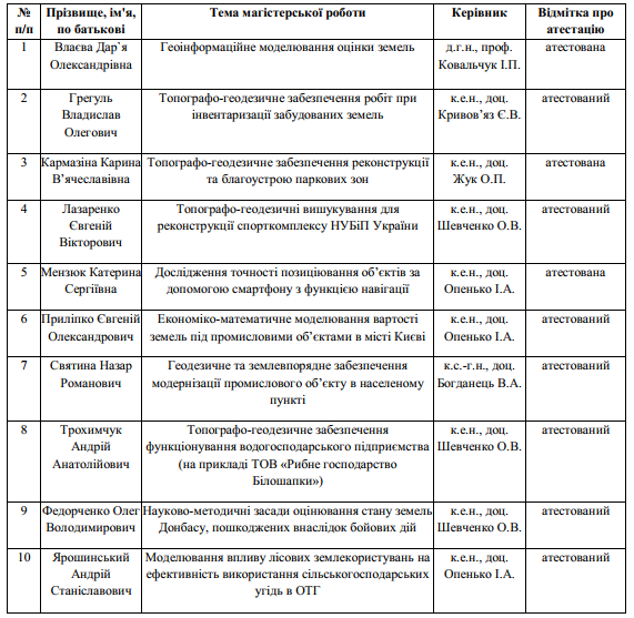 В цілому, науково-педагогічні працівники відзначили різноманітність тематики, домінування робіт геодезично-картографічно-землевпорядного спрямування. Усі одностайно прийняли рішення атестувати магістрів першого року навчання.