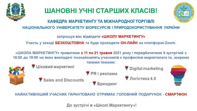 З 11 по 21 травня 2021 року на базі кафедри маркетингу та міжнародної торгівлі НУБіП України розпочне свою діяльність онлайн «Школа Маркетингу». Під час онлайн зустрічей, які будуть проходити на платформі Zoom, в цікавій інтерактивній формі буде висвітлено ряд актуальних питань маркетингу. У заході безкоштовно зможуть прийняти участь учні 9, 10 та 11 класів.