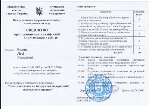 Тож 21-24 липня 2020 року в онлайн режимі старший викладач кафедри статистики та економічного аналізу економічного факультету Воляк Леся Романівна пройшла курси підвищення кваліфікації на базі Центру розвитку кадрового потенціалу Сумського державного університету «Блог викладача як інструмент модернізації навчального процесу».