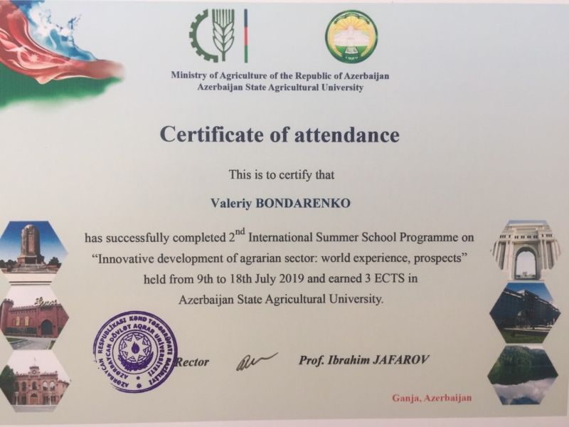 Бондаренко Валерій пройшов навчання в Міжнародній літній школі Азербайджанського державного аграрного університету (ADAU)
