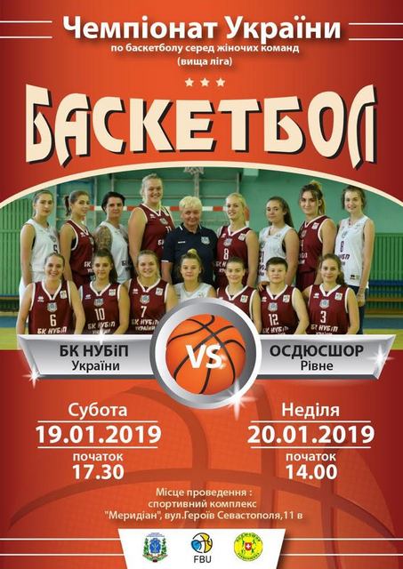 Жіноча збірна команда студентів НУБіП України з баскетболу 19 і 20 січня 2019 року, у другому колі ХХУІІІ Чемпіонату України з баскетболу серед жіночих команд вищої ліги сезону 2018-2019 років, група 2, зустрінеться в Києві з командою ОСДЮСШОР м. Рівне.