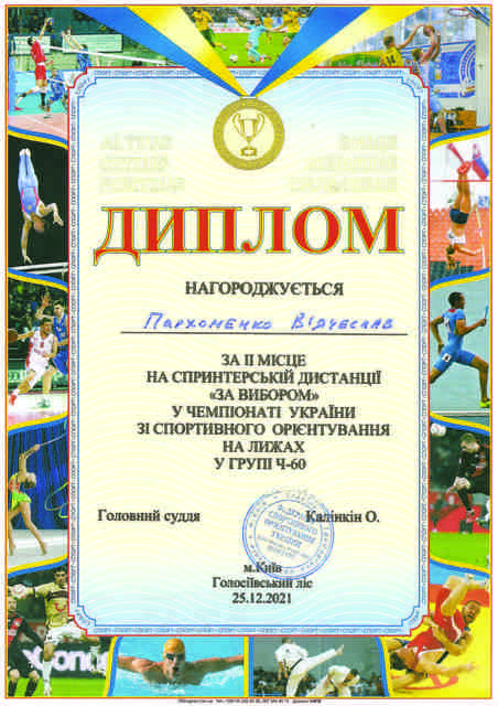У змаганнях серед ветеранів 2 місця на дистанції спринту за вибором і середній дистанції у заданому напрямку та 1 місце на довгій дистанції зайняв В’ячеслав ПАРХОМЕНКО – старший викладач кафедри фізичного виховання гуманітарно-педагогічного факультету.