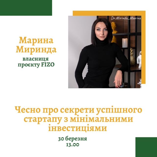 Запрошуємо студентів на зустріч з практиком - власником проєкту Fizo Миринда Мариною, яка володіє великим досвідом роботи в проєктному менеджменті, адже працювала стартап менеджером і членом ради директорів мережі фітнес клубів SportLife. Під її керівництвом було запущено більше 250 проєктів в сфері спорту, здоров’я, б’юті і спа, освіти і комунікації. Зустріч відбудеться 30 березня о 13.00 на платформі ZOOM за посиланням Идентификатор конференции: 753 263 4412 Код доступа: 3524636