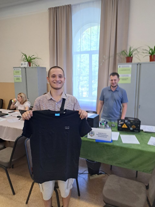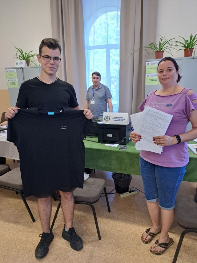 Цьогоріч першими вступниками факультету інформаційних технологій, які оформили договір на навчання стали Данил Бартєньєв та Олексій Неізвєстний та отримали брендовані футболки від багаторічного партнера факультету компанії Cisco.