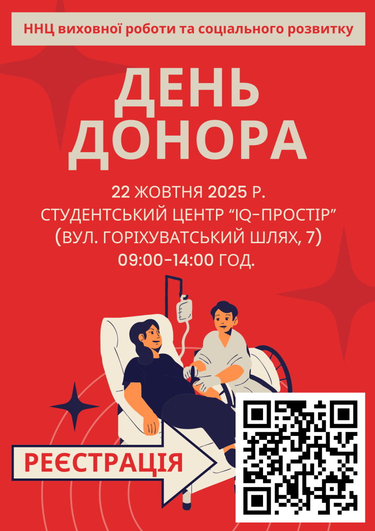 Донація проходитиме у студентському центрі "IQ-простір" (вул. Горіхуватський шлях, 7).