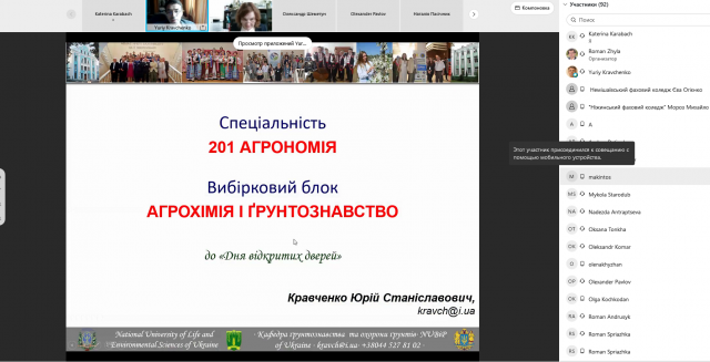 Представники кафедр коротко ознайомили з діяльністю і навчальною базою своїх кафедр. Деякі розповіді супроводжувалися on-line відео з лабораторій і дослідних полів, що дозволило абітурієнтам скласти максимально близьке до реальності уявлення про місце свого майбутнього навчання. Кафедру ґрунтознавства та охорони ґрунтів ім. проф. Шикули М.К. презентував у своїй доповіді доцент кафедри, кандидат с.-г. наук Кравченко Юрій Станіславович.