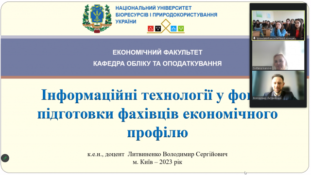 В рамках співпраці з економічним факультетом НУБіП України та з метою профорієнтації, відбулася гостьова онлайн-лекція з Володимиром Литвиненком, к.е.н., доцентом кафедри обліку та оподаткування на тему: «Інформаційні технології у фокусі підготовки фахівців економічного профілю» для студентів 3 курсу економічного відділення ВСП «Ірпінський фаховий коледж НУБіП України».