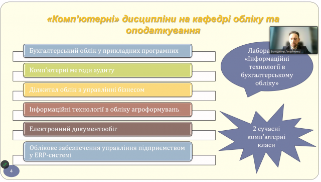 Перед початком лекції Володимир Сергійович наголосив на перевагах навчання на економічному факультеті Національного університету біоресурсів і природокористування України, а саме на кафедрі обліку та оподаткування. Розповів про сучасні комп’ютерні дисципліни, що викладаються на кафедрі та запросив студентів відвідати лабораторію Інформаційних технологій в бухгалтерському обліку та комп’ютерні класи.