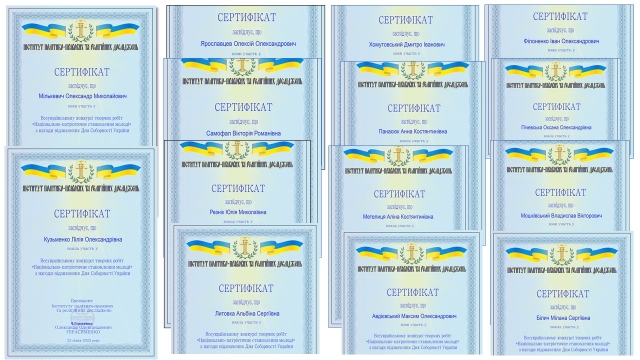 -факультет інформаційних технологій, І курс, спеціальність «комп’ютерна інженерія» - Мількевич Олександр, Хомутовський Дмитро, Ярославцев Олексій; спеціальність «інженерія програмного забезпечення» - Авдієвський Максим, Вознюк Григорій, Литовка Альбіна, Панасюк Анна, Філоненко Іван; спеціальність “кібербезпека” - Білич Мілана, Пічевська Оксана, Самофал Вікторія; спеціальність «економічна кібернетика» - Метелиця Аліна.