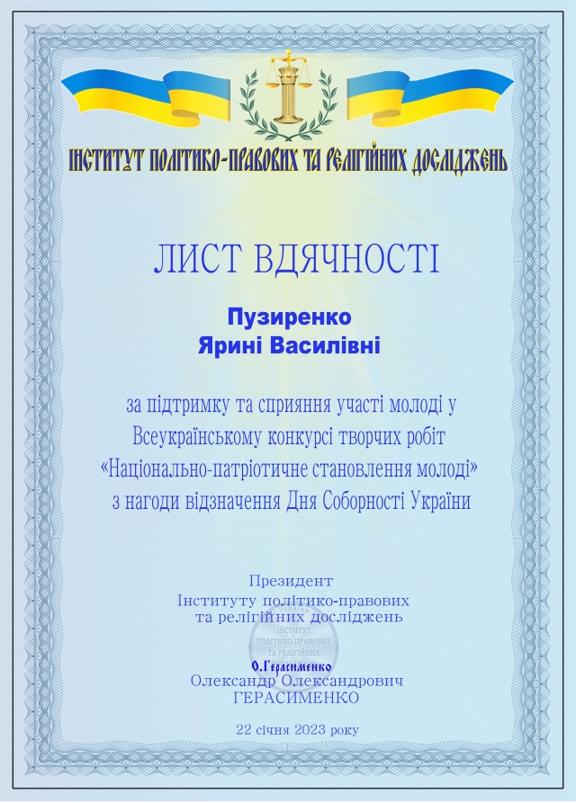 З нагоди відзначення Дня Соборності України Інститут політико-правових та релігійних досліджень за підтримки органів державної влади, місцевого самоврядування, провідних творчих та громадських об’єднань, наукових установ провів Всеукраїнський конкурс творчих робіт «Національно-патріотичне становлення молоді».