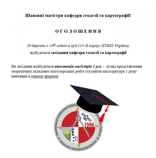 До уваги магістрів та співробітників кафедри! 30 березня 2023 р. відбудеться засідання кафедри геодезії та картографії 24 березня 2023 року 02:00 - 02:00