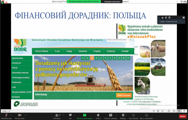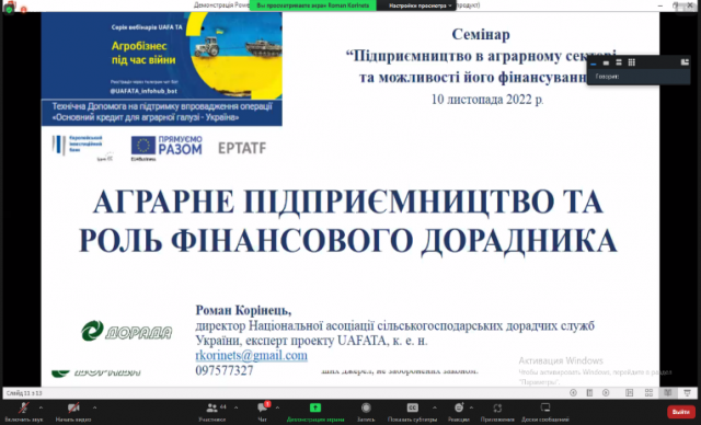 Пізнавальною була доповідь “Залучення державних та міжнародних фінансових ресурсів для розвитку аграрного підприємництва” виступив експерт Проєкту UAFATA Олег Осаулюк. Цікавою була доповідь на тему “Європейський досвід дорадництва для забезпечення потреб агробізнесу” НААСДУ, директора Романа Корінця. Дякуємо модератору та виступаючим за цікавий та пізнавальний вебінар.