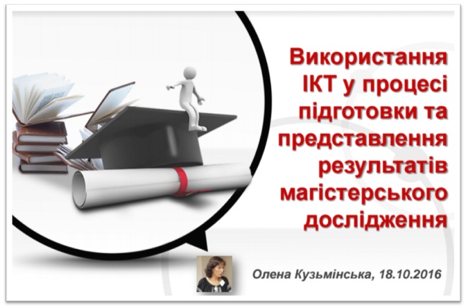 В рамках проведення семінару для магістрів другого року навчання НУБіП України на тему: Представлення результатів досліджень засобами ІКТ та порядок заходів із запобігання академічному плагіату, що проводився 18 жовтня 2016 року (http://nubip.edu.ua/node/25672), доцент кафедри Олена Кузьмінська виступила із доповіддю Використання ІКТ у процесі підготовки та представлення результатів магістерського дослідження (https://goo.gl/eJ7TjE).