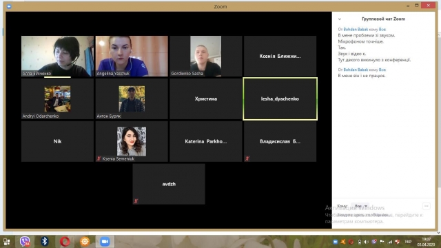 У зв'язку з поширенням коронавірусу в Україні тривають навчальні заняття у вищій школі дистанційно, з використанням спеціальних навчальних платформ. Так, нещодавно було проведене відеозаняття з англійської мови зі студентами 4 курсу (5, 3, 1 групи) агробіологічного факультету з використанням відеосервісу ZOOM. Оскільки студенти були заздалегідь проінформовані викладачем про дату і час заняття, вони змогли вчасно приєднатися до конференції та опрацювати відповідні завдання з підготовки до ЄВІ за відповідними підручниками та тестовими зошитами.