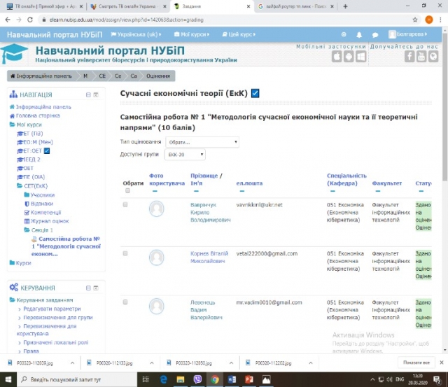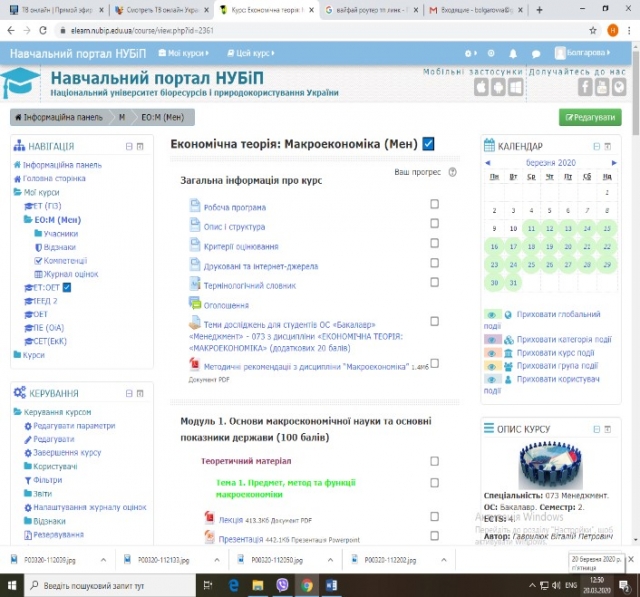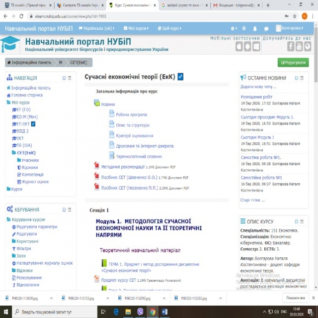 Навчальна дисципліна «Сучасна економічна теорія» для студентів 1 курсу факультету інформаційних технологій, спеціальностей: 051 «Економіка (Економічна кібернетика)» та 051 «Економіка (Цифрова економіка)» (https://elearn.nubip.edu.ua/course/view.php?id=1903) розроблений та атестований у 2018 р.;