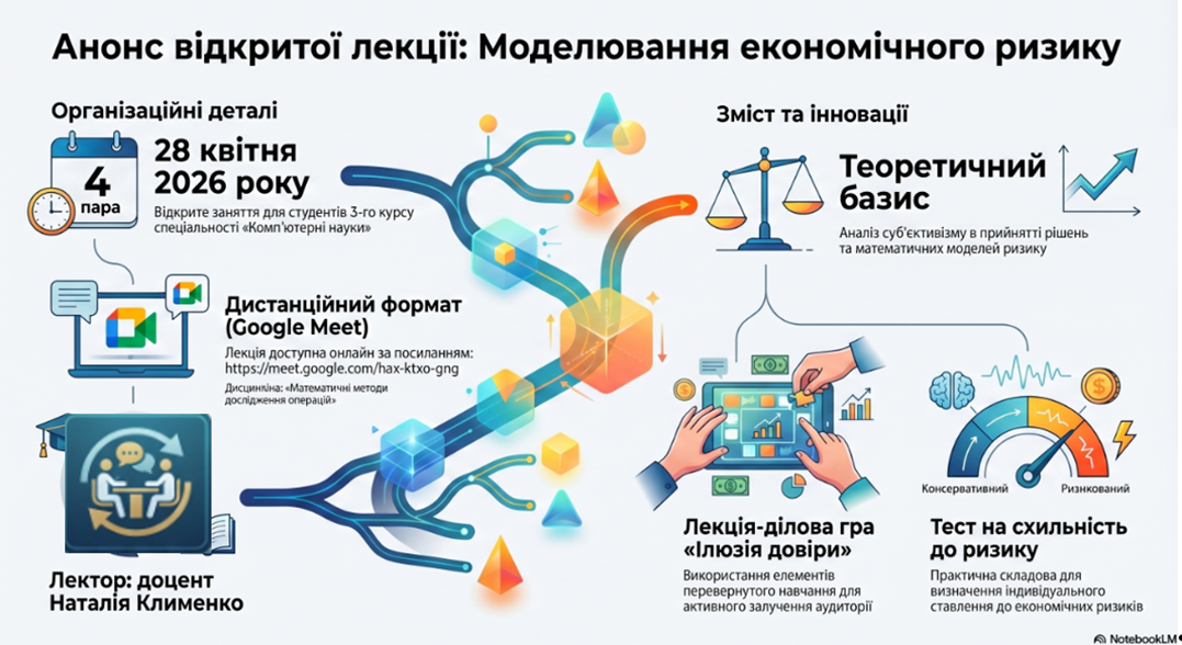 Факультет інформаційних технологій запрошує на відкриту лекцію кафедри економічної кібернетики Приходьте, буде цікаво! 28 квітня 2026 року 13:30 - 14:50 Формат: Дистанційна