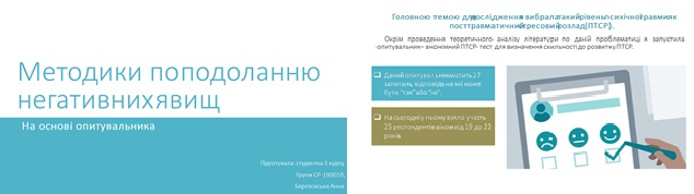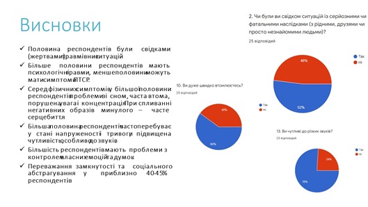 Для формування практичних та аналітичних навичок було поставлено завдання розробити опитувальник з метою виявлення негативних проявів у поведінці особистоті, як наслідку психологічної травми і врахування теперішніх неспокійних умов життя. А також проаналізувати результати, відповідно до яких розробити стратегію подолання або профілактики виявленого негативного явища.