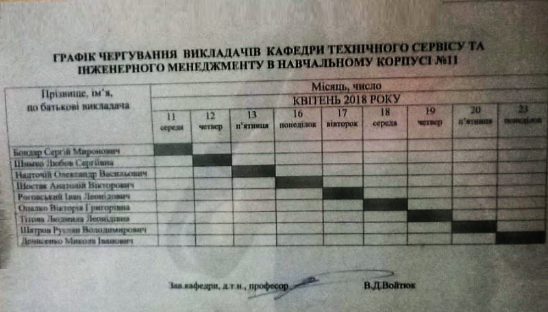 Графік чергування викладачів кафедри технічного сервісу та інженерного менеджменту в навчальному корпусі №11