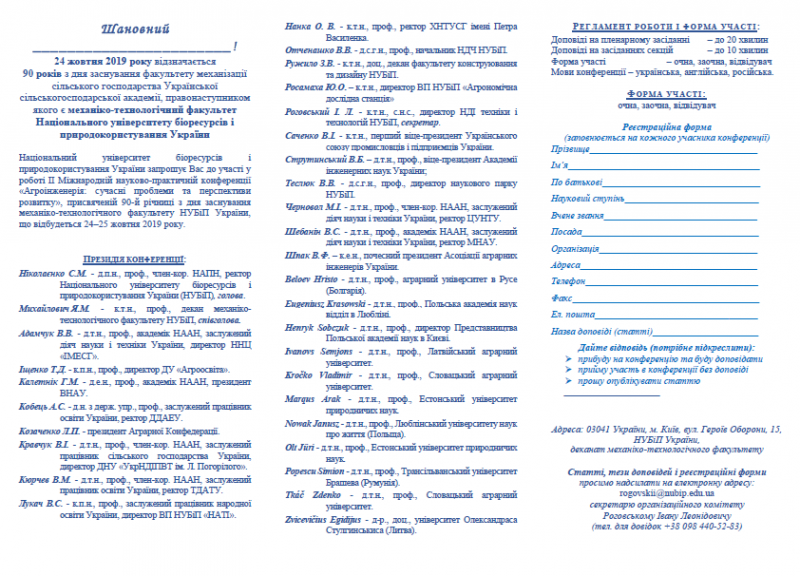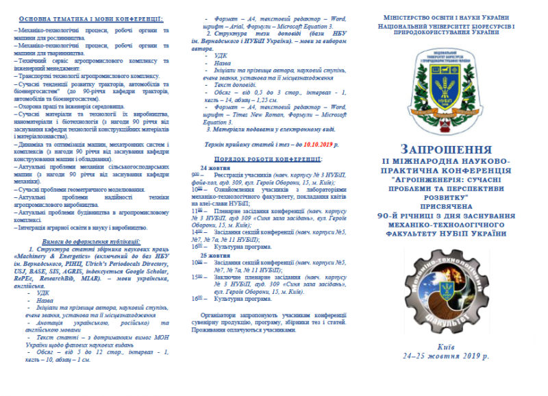 ІІ Міжнародна науково-практична конференція «Агроінженерія: сучасні проблеми та перспективи розвитку», присвячена 90-й річниці з дня заснування механіко-технологічного факультету НУБіП України 24 жовтня 2019 року 03:00 - 03:00