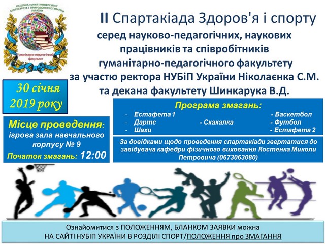 ІІ спартакіада здоров`я і спорту науково-педагогічних, наукових працівників і співробітників гуманітарно-педагогічного факультету Положення про другу спартакіаду здоров’я і спорту серед науково-педагогічних, наукових працівників і співробітників гуманітарно-педагогічного факультету НУБіП України 30 січня 2019 року 02:00 - 02:00