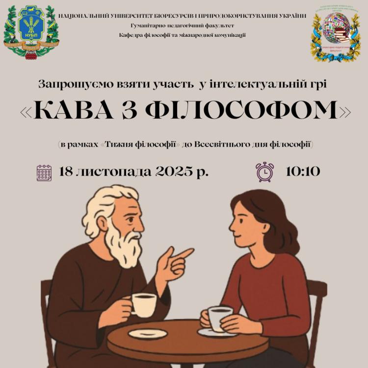 Кафедра філософії та міжнародної комунікації НУБіП України запрошує студентів взяти участь у творчому та пізнавальному заході - «Кава з філософом», що відбудеться у межах Тижня філософії.