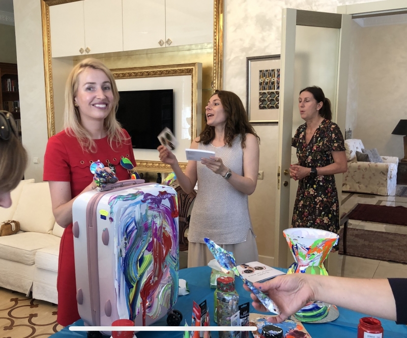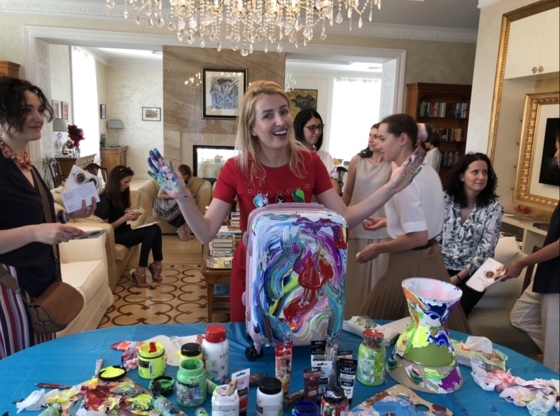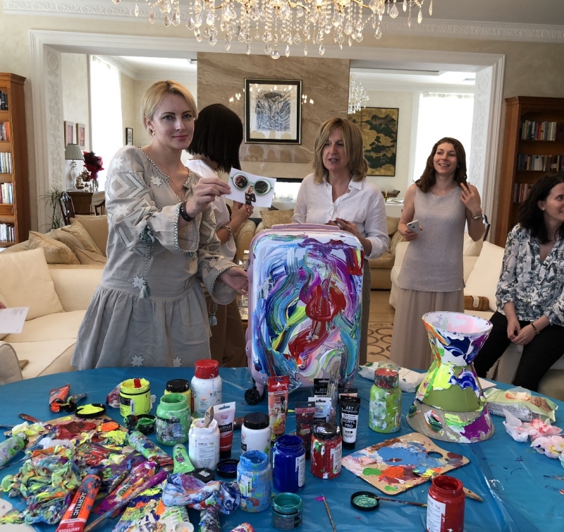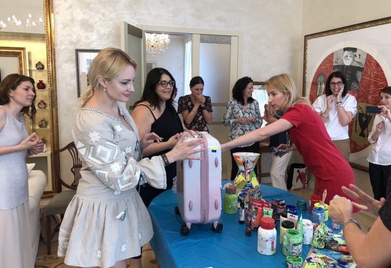 Господиня свята пані Валентина запросила відому креативну художницю Ольгу Кошелєву на творчу зустріч у резиденцію Італії. Ольга знана мисткиня, - учасниця виставок в Україні, США, Франції, Монако, Італії, Канаді. Ольга Кошелєва: «ця тепла дружня зустріч дуже сподобалася. Вдячна за інтерес до сучасного живопису, за запрошення пані Валентині. Я щаслива, що багатьом подобається моє бачення мистецтва. Кожен спробував себе художником на мить, розмальовуючи валізу для подорожей.... неймовірним акцентом є ідея Вероніки Чекалюк поєднати кольори прапору - так прикрасити валізу, котра у майбутньому обїде увесь світ. Поетизацію валізи доповнила доречнна пропозиція Вероніки, яку підтримали усі гості: кожен написав листівку із побажаннями для власниці валізи-шедевру, своє вітання дівчата писали у прозі і віршах. Цього дня ми усі разом із звичайної валізи зробили шедевр, красивий аксесуар з позитивними емоціями щастя. Взагалі, моє мистецтво стосується нашого крихкого співіснування з екосистемою Землі, не втрачаючи при цьому почуття гумору. У жовтні запрошую на столичну виставку».